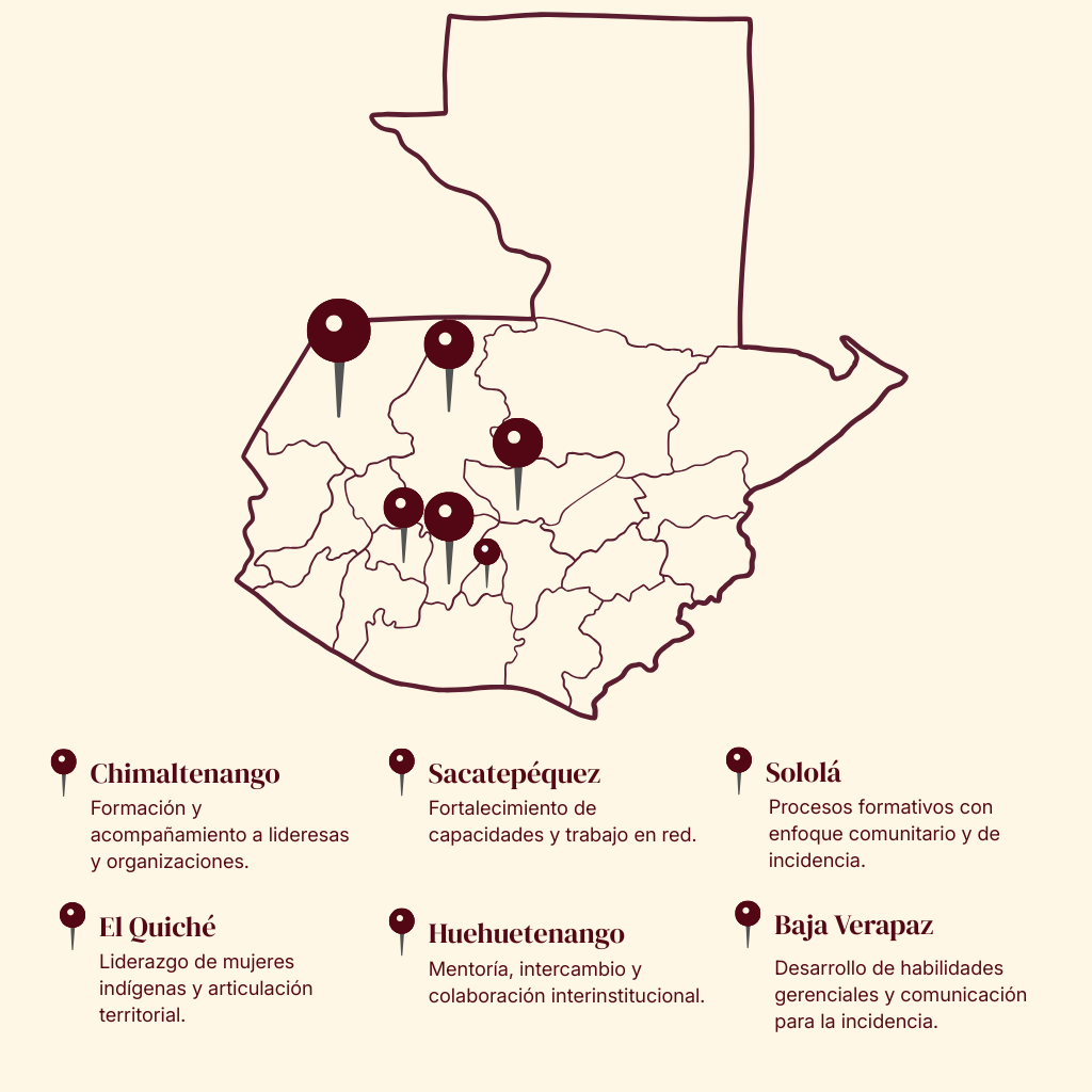Nuestro trabajo se desarrolla en territorios donde las alianzas y la formación multiplican el impacto. Actualmente acompañamos liderazgos en 6 departamentos de Guatemala, fortaleciendo capacidades y colaboración entre organizaciones y comunidades.